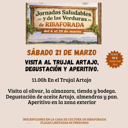 Visita al olivar, almazara, tienda y bodega más degustación de aceite Artajo, almendras y pan. El desplazamiento se hará por cuenta de las/los participantes.